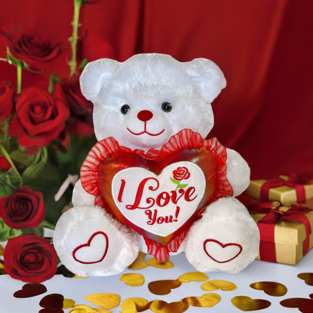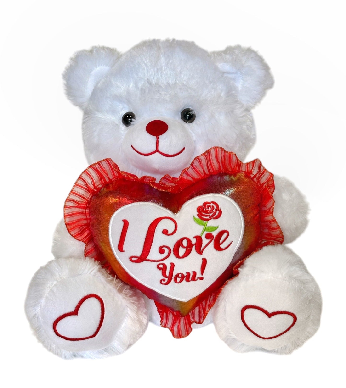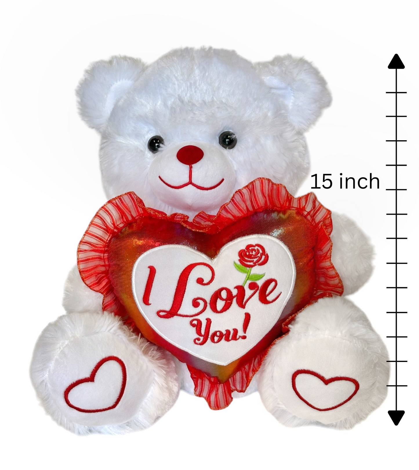 Crafted with soft and plush materials, this 15" musical Valentine bear in white features a red heart with the endearing message "I Love You". It is an impeccable present for your significant other on the day of love. With a height of 15" when seated.