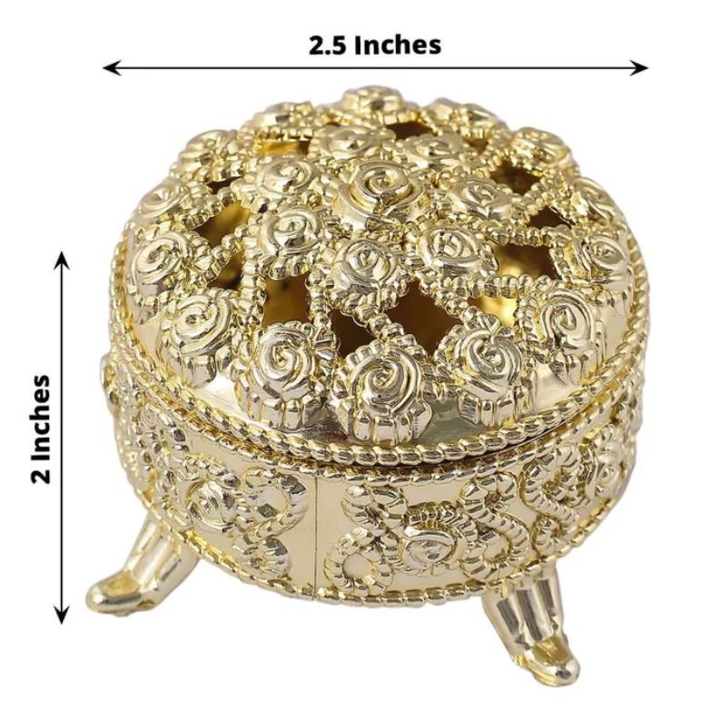- Luxurious Aesthetic: These trinket boxes boast a refined gold finish that exudes elegance, perfect for enhancing the visual appeal of wedding table decorations with a touch of opulence