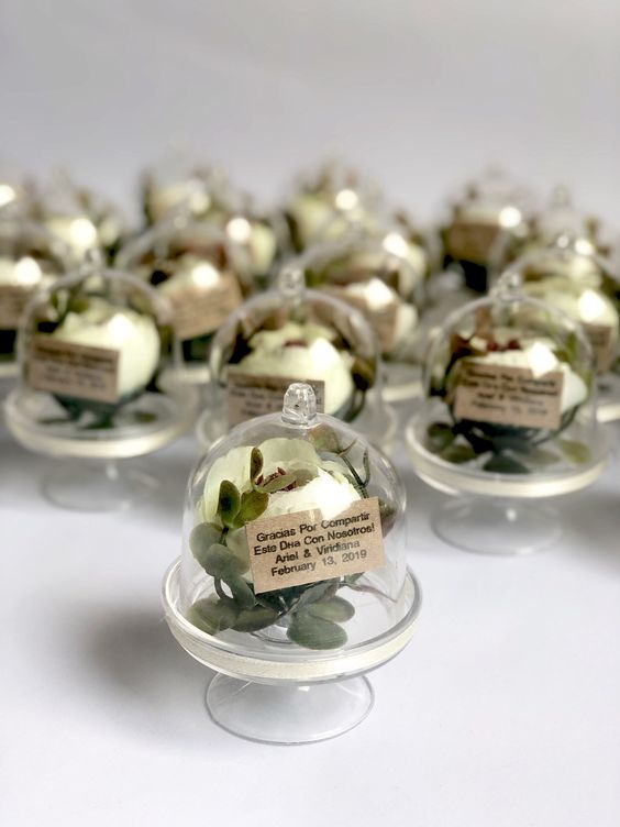 These mini plastic cake holders with a dome in our collection are so cute. They are ideal for storing small treats such as chocolate and candy. You can just decorate them with your favorite ribbon to make your party favors. They make for great keepsakes for your events like wedding, Mis quince, and baby shower. (Ribbon and candy are not included)