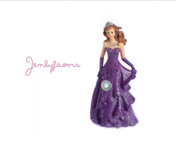 Mis Quince Anos Purple Cake Topper Doll with LED Light-up. A quince is one of the most important days in a young girl’s life. Dazzle your daughter as well as your guests with our Victorian quince Anos dolls. These lovely dolls are features posing in her sparkling dress holding a rose bouquet as well as a light with the number 15 on it.