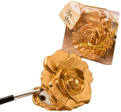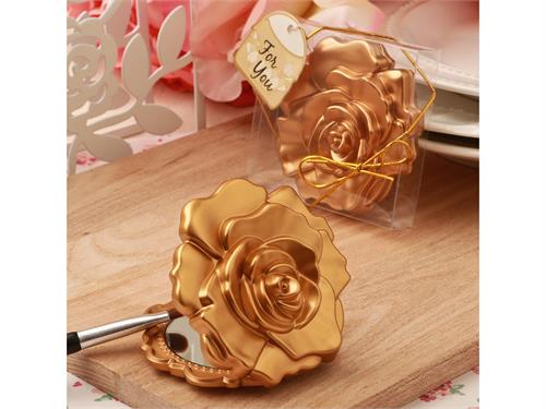Our compact mirror is manufactured from hard molded plastic in a two-dimensional design, featuring a stunning ornate rose finished in a matte golden color. The compact opens at the side with a hinge and reveals two glass mirrors. One is a regular mirror and the second is magnified.