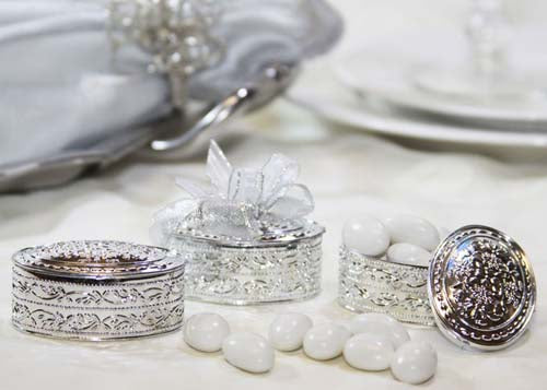 These plastic oval box favors are great decorations for any special occasion, like the wedding, Mis Quince, anniversary, birthday, baby shower and more. Each box has sufficient space to store treats. These favors are visually compelling with lovely embossed designs all around each box.