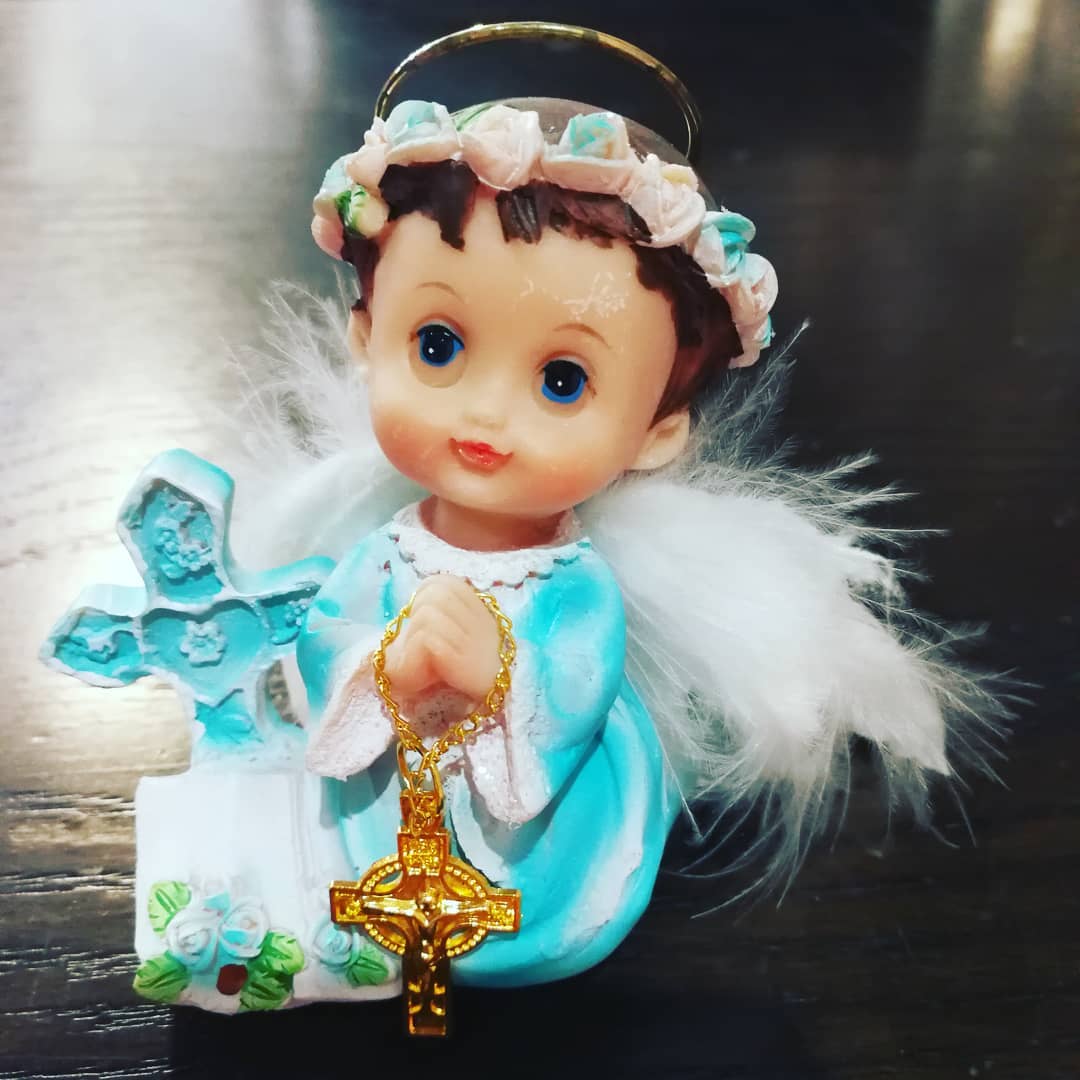 This Exquisite Favor comes as a Praying Baby Angel holding a gold metal cross with feathered wings and a Gold Hallow crown. This baby angel figurine is perfect for your baptism decoration and favors.