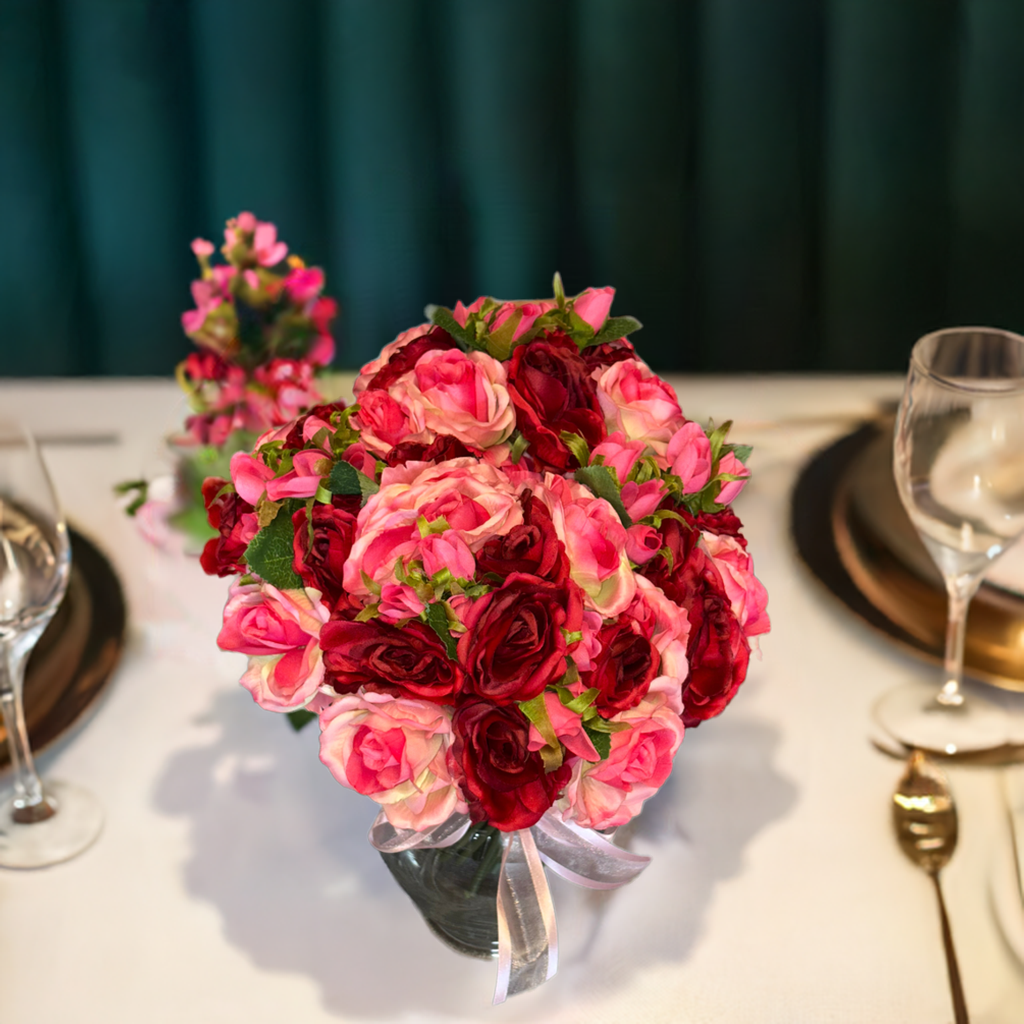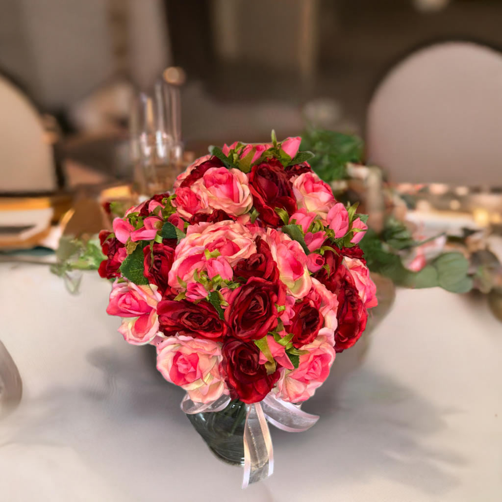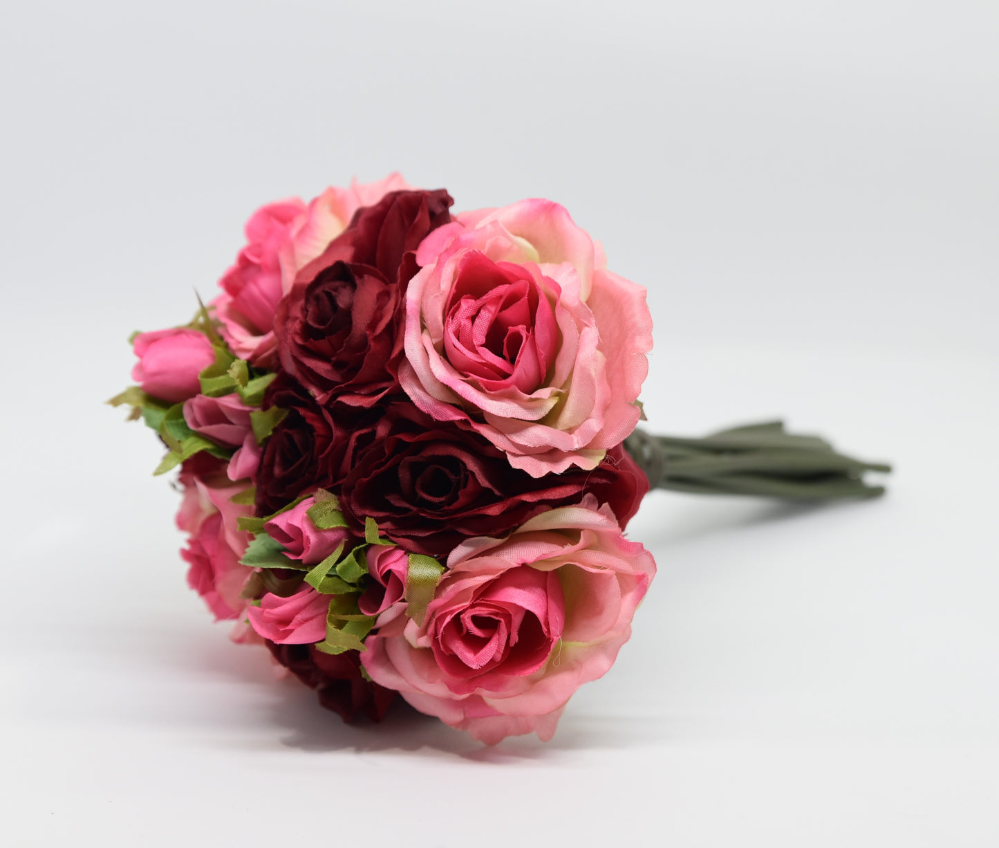 Our rose silk flower wedding bouquet is a perfect bouquet for bride and her bridesmaids. Each bouquet has 11 stems (9 stems of open rose & 2 stems of rose buds). Each open rose head is about 3 inches in diameter. Simply arrange it to appear full. Each bouquet is 11" tall, the bouquet measures approximately 8" in diameter.