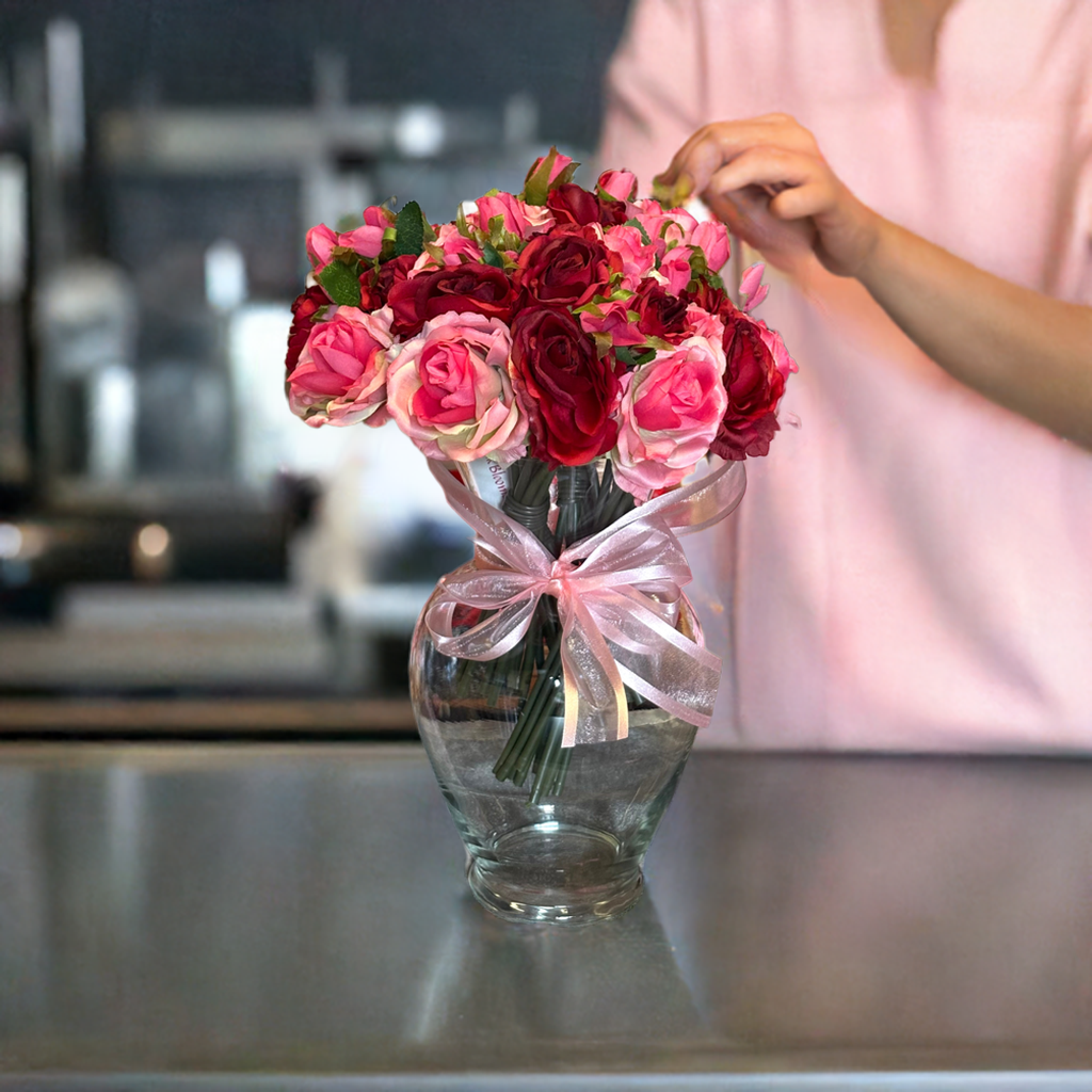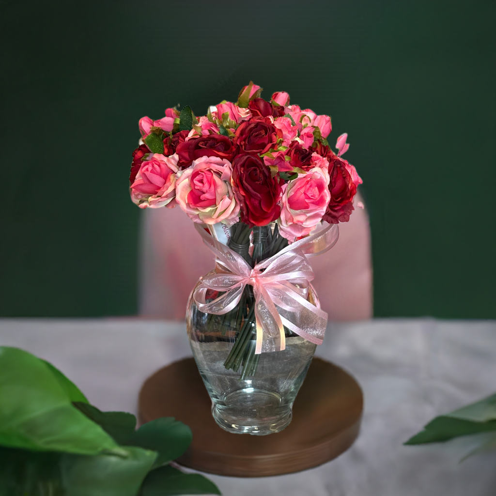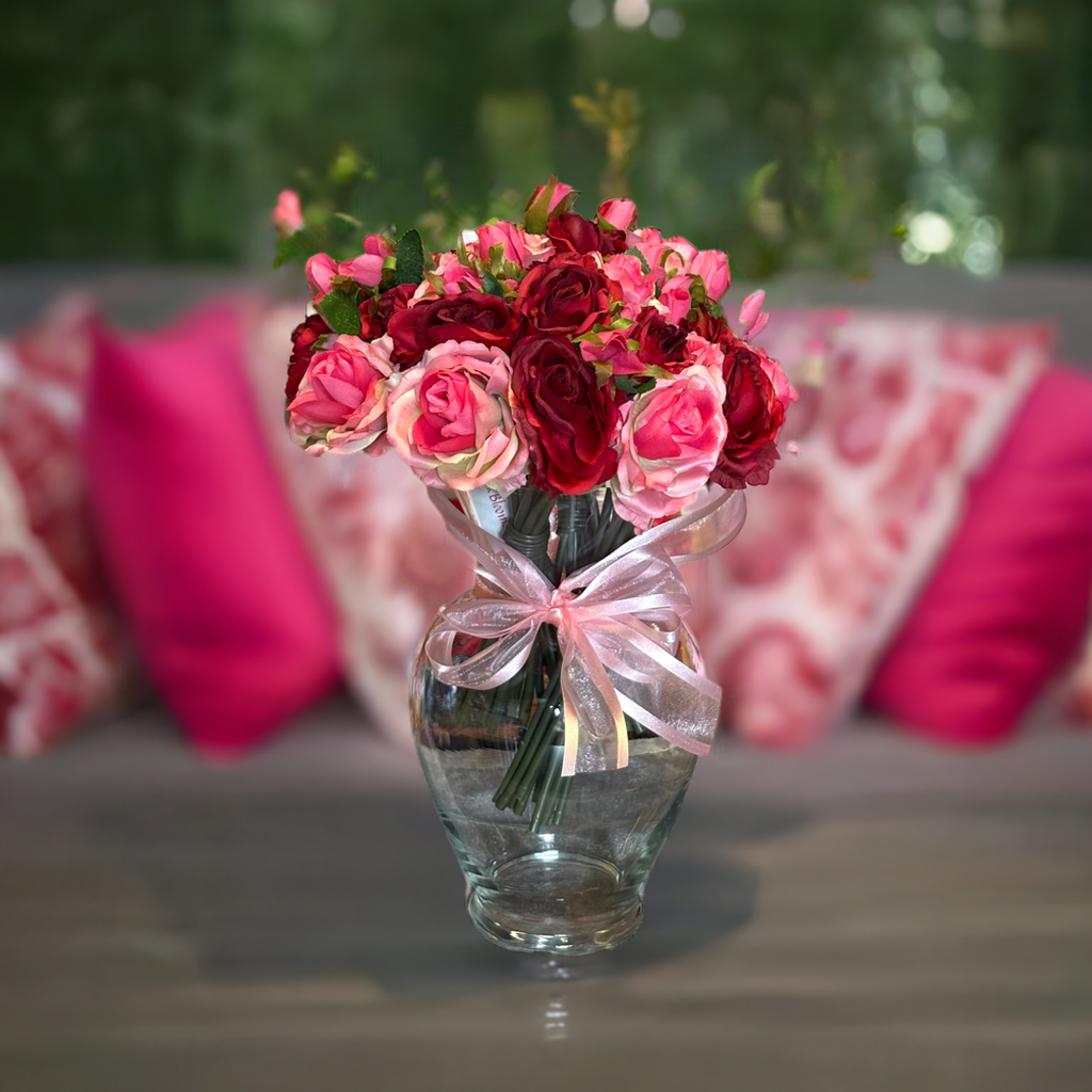 Our rose silk flower wedding bouquet is a perfect bouquet for bride and her bridesmaids. Each bouquet has 11 stems (9 stems of open rose & 2 stems of rose buds). Each open rose head is about 3 inches in diameter. Simply arrange it to appear full. Each bouquet is 11" tall, the bouquet measures approximately 8" in diameter.