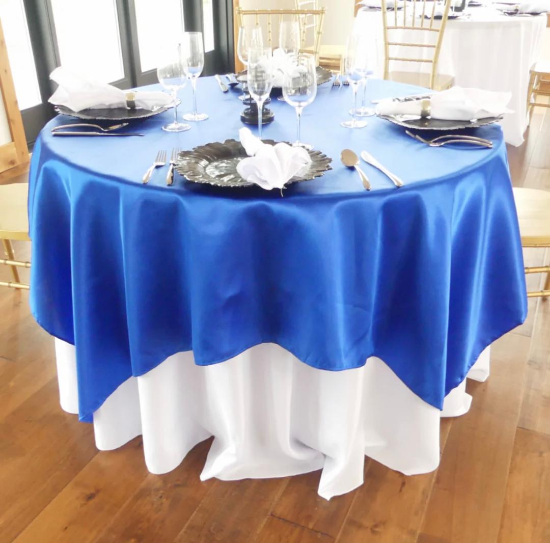High quality royal blue satin table overlay. Uses for table cover overlay, wedding, parties, celebrations, or any special event.