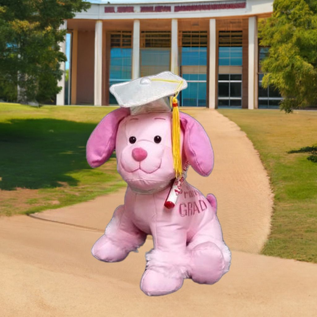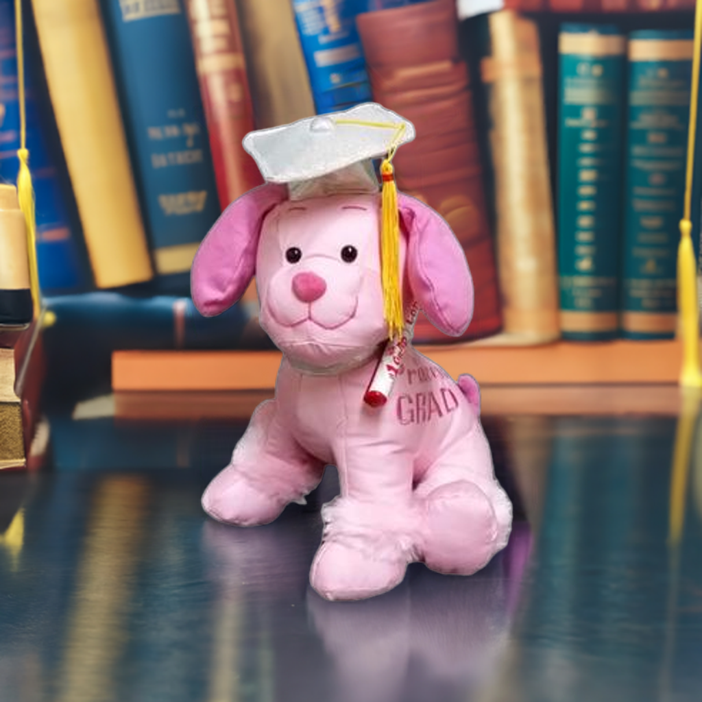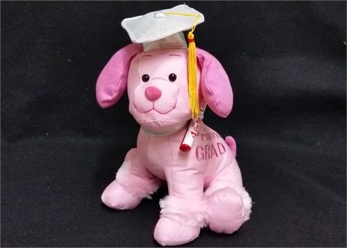 This 10.5" pink graduation dog is adorable and beautiful. It wears a graduation hat with a yellow tassel. And It says Princess GRAD! on the side. It also comes with the # 1 grad congrats! pen.