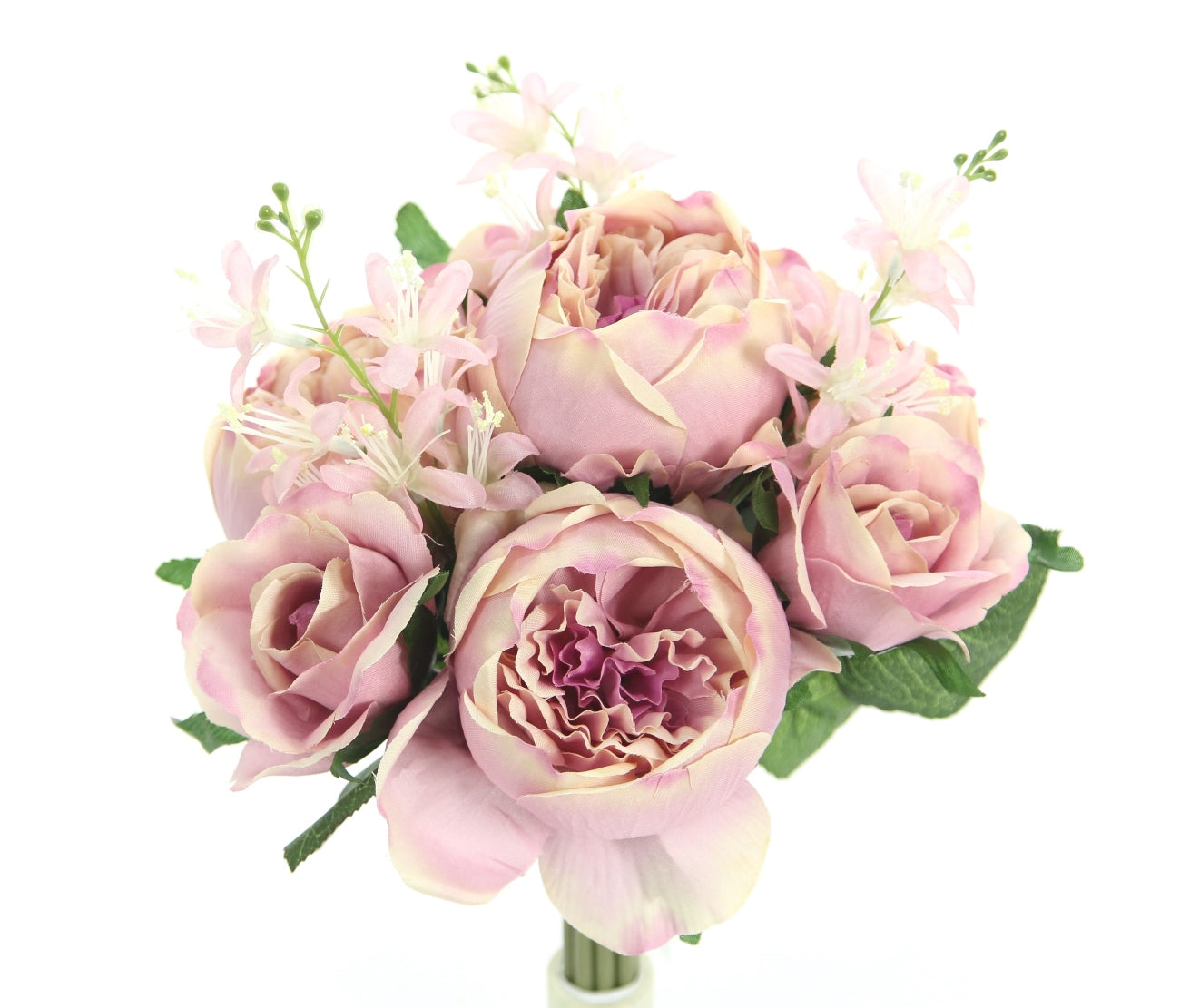 Our rose silk flower wedding bouquet is a perfect bouquet for the bride and her bridesmaids. The bouquet features opened roses and rosebuds. Each bush is 10" tall, designed with 4 opened roses and 3 rose buds. The bouquet measures approximately 8" in diameter.