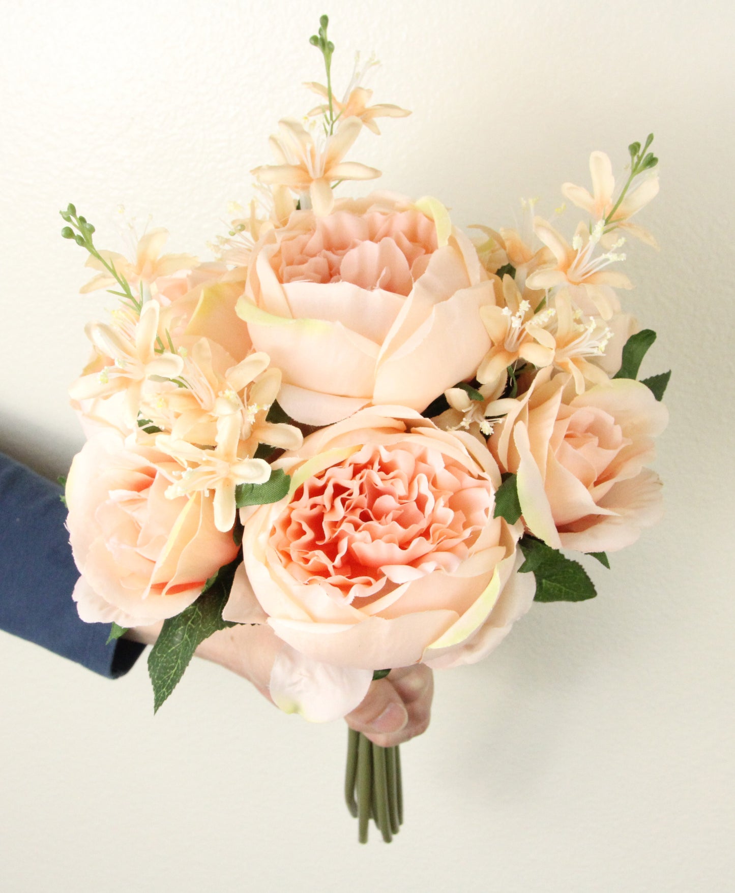 Our rose silk flower wedding bouquet is a perfect bouquet for the bride and her bridesmaids. The bouquet features opened roses and rosebuds. Each bush is 10" tall, designed with 4 opened roses and 3 rose buds. The bouquet measures approximately 8" in diameter.