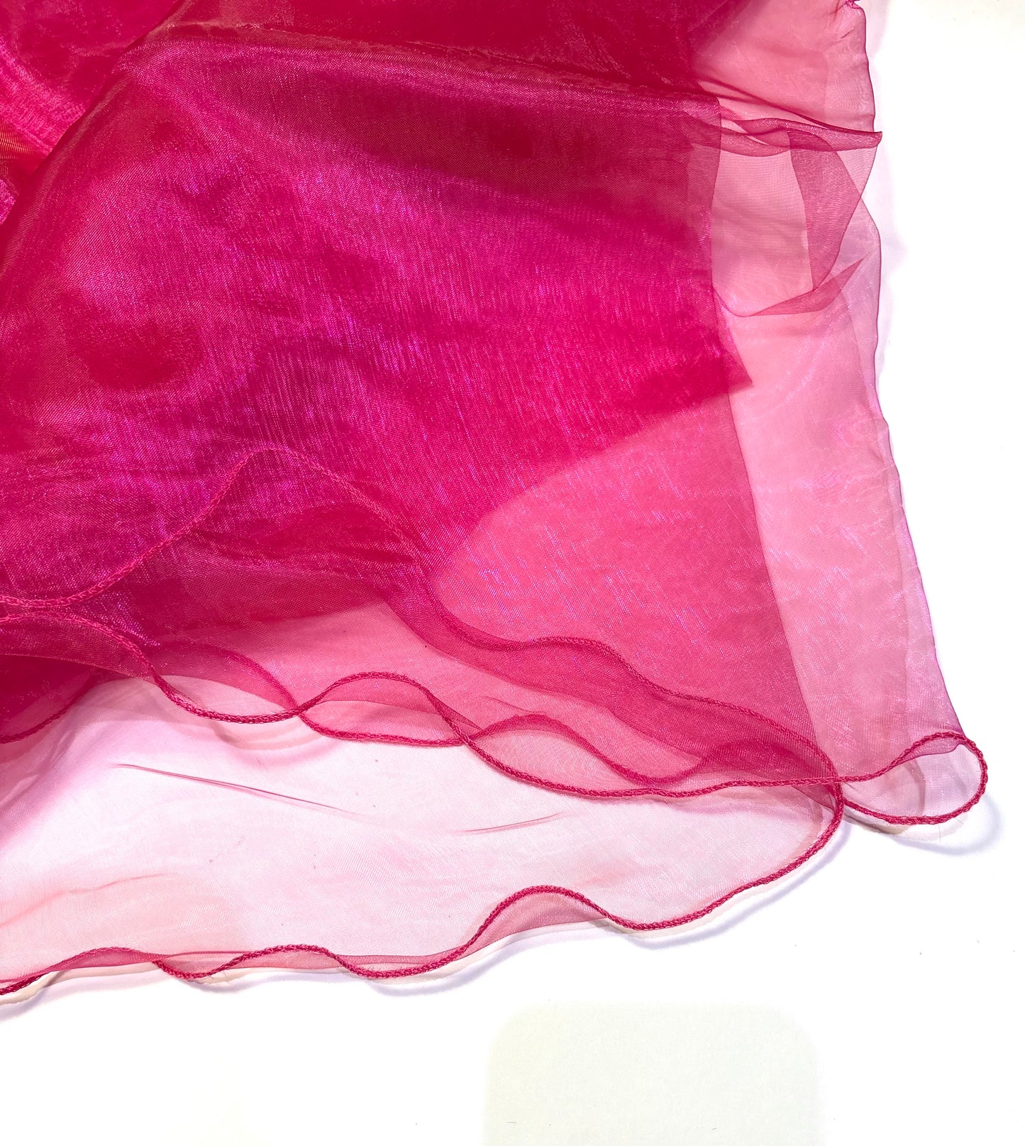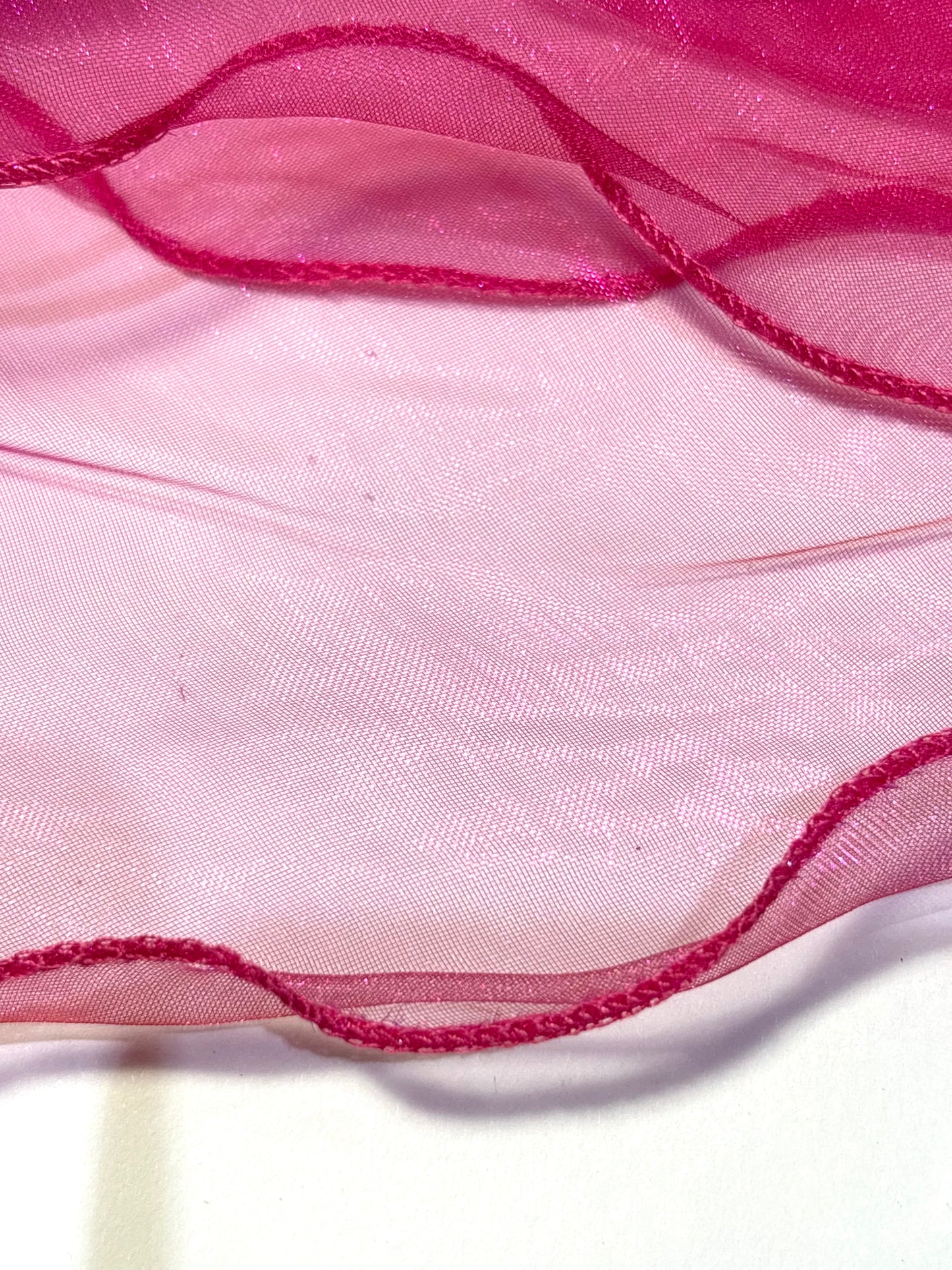 High-quality Seamless, ruffled edge fuchsia organza table overlay.Uses for table cover overlay, wedding, parties, celebrations, or any special event.