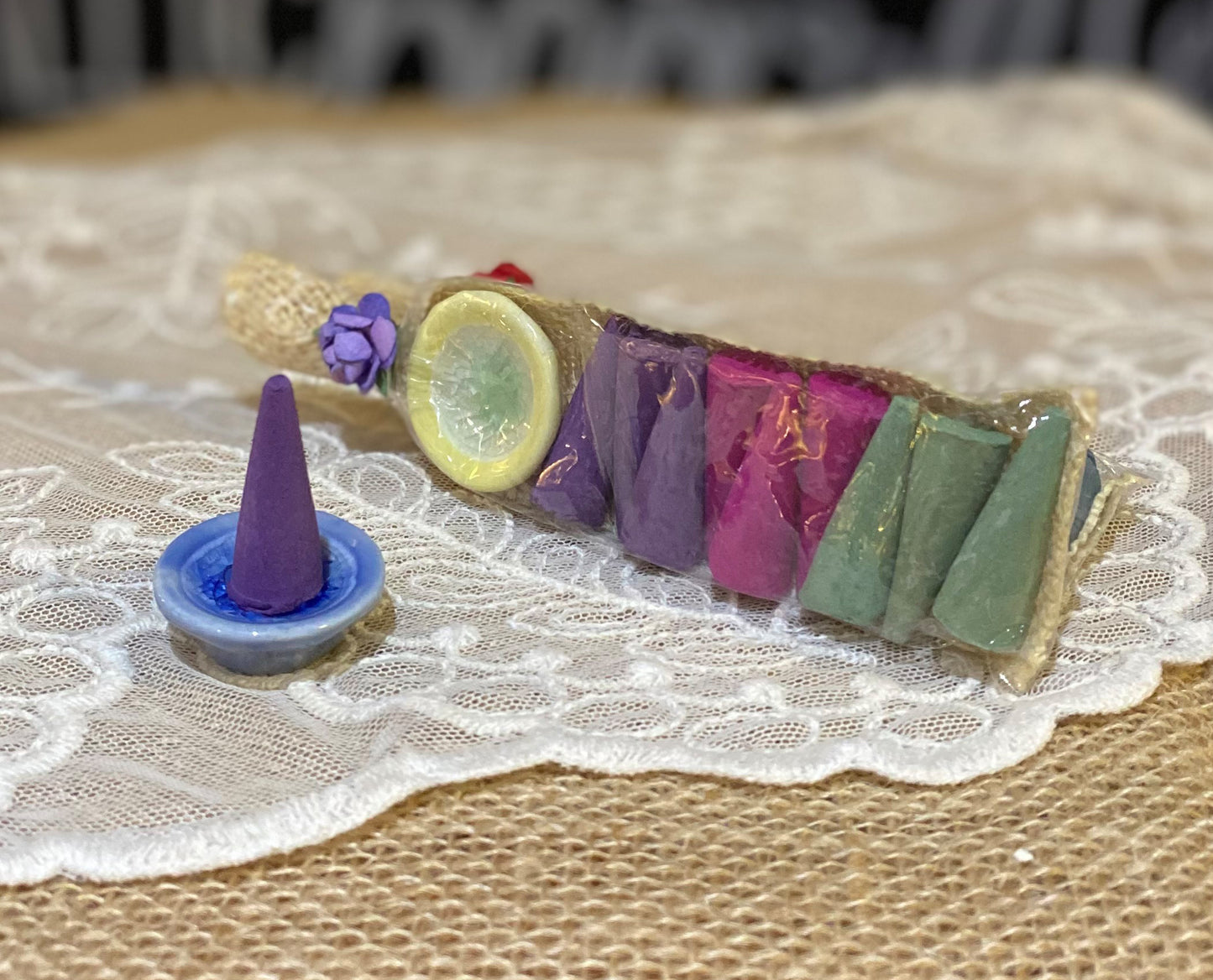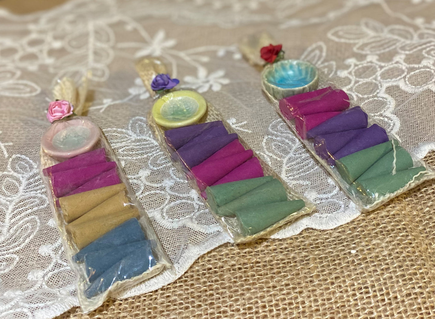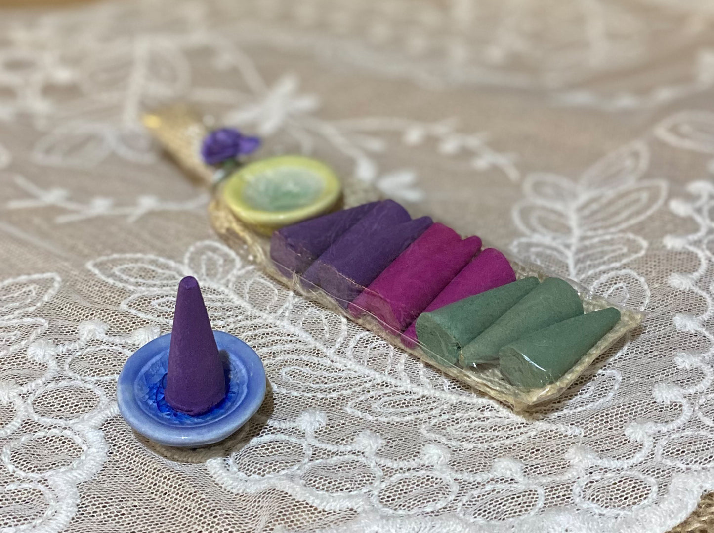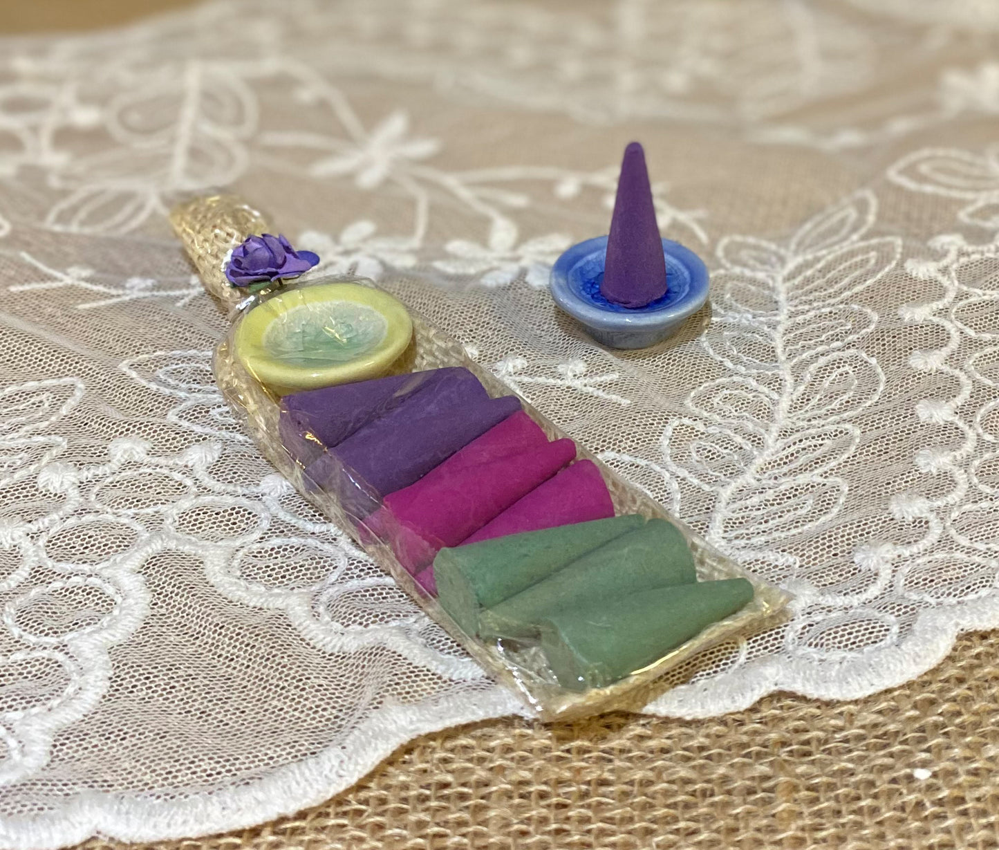 Each set contains 9 mixed cone incense scents, and a ceramic incense holder.