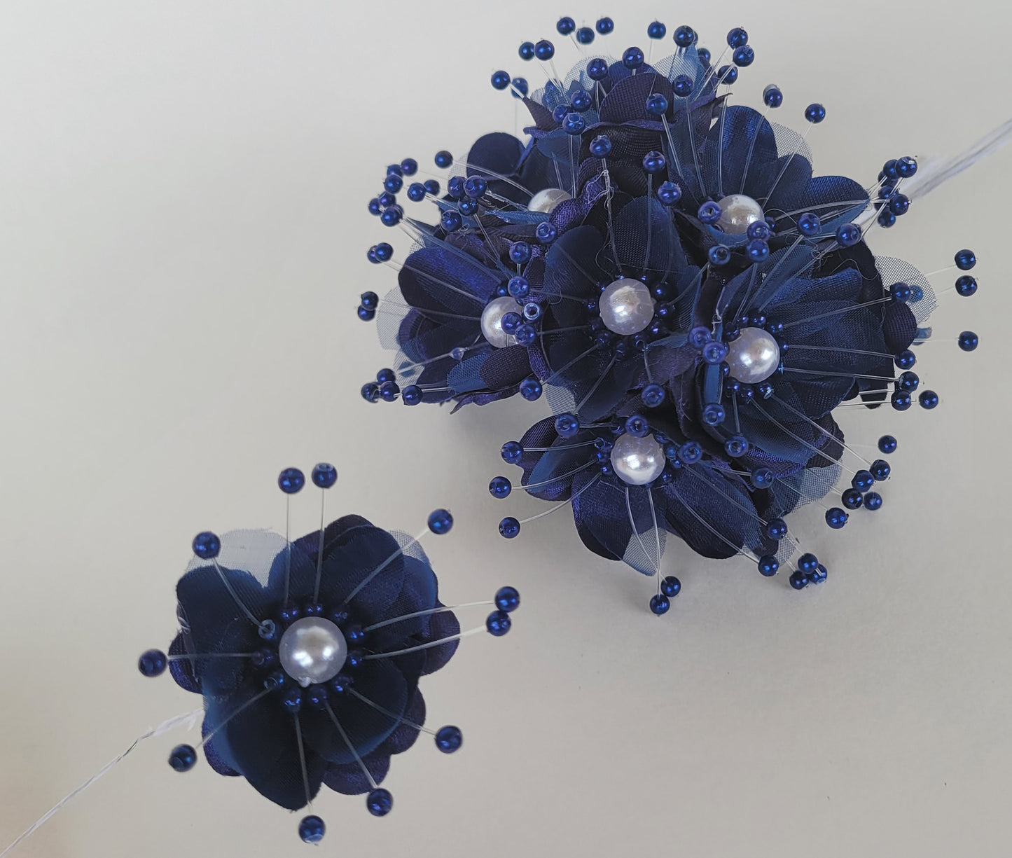 - ♔GORGEOUS MIXTURE & UNIQUE DESIGN- Navy Blue Organza and Satin Flower with Pearl Spray set contains a beautiful flowers, as well as some plastic stems to use for floral arrangements. The blossoms are made of organza flowers with a white pearl center and pearl spray. Vibrant color and elegant touch make it more real. A pack of beautiful Navy Blue flower, which makes for a very attractive, nicely-toned arrangement. Go well with the florals you already have at home. Great for filling your living space