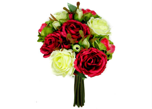 Our rose silk flower wedding bouquet is a perfect bouquet for the bride and her bridesmaids. The bouquet features opened roses and rosebuds. Each bush is 10" tall, designed with 9 opened roses and 6 rose buds. The bouquet measures approximately 8" in diameter.