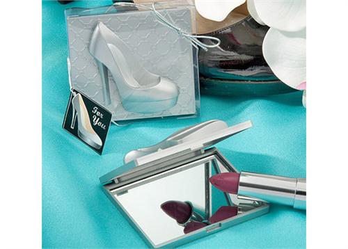 The mirror is packaged in a clear box with a metallic silver ribbon wrap and bow with an attached matching high heel design "For You" tag.