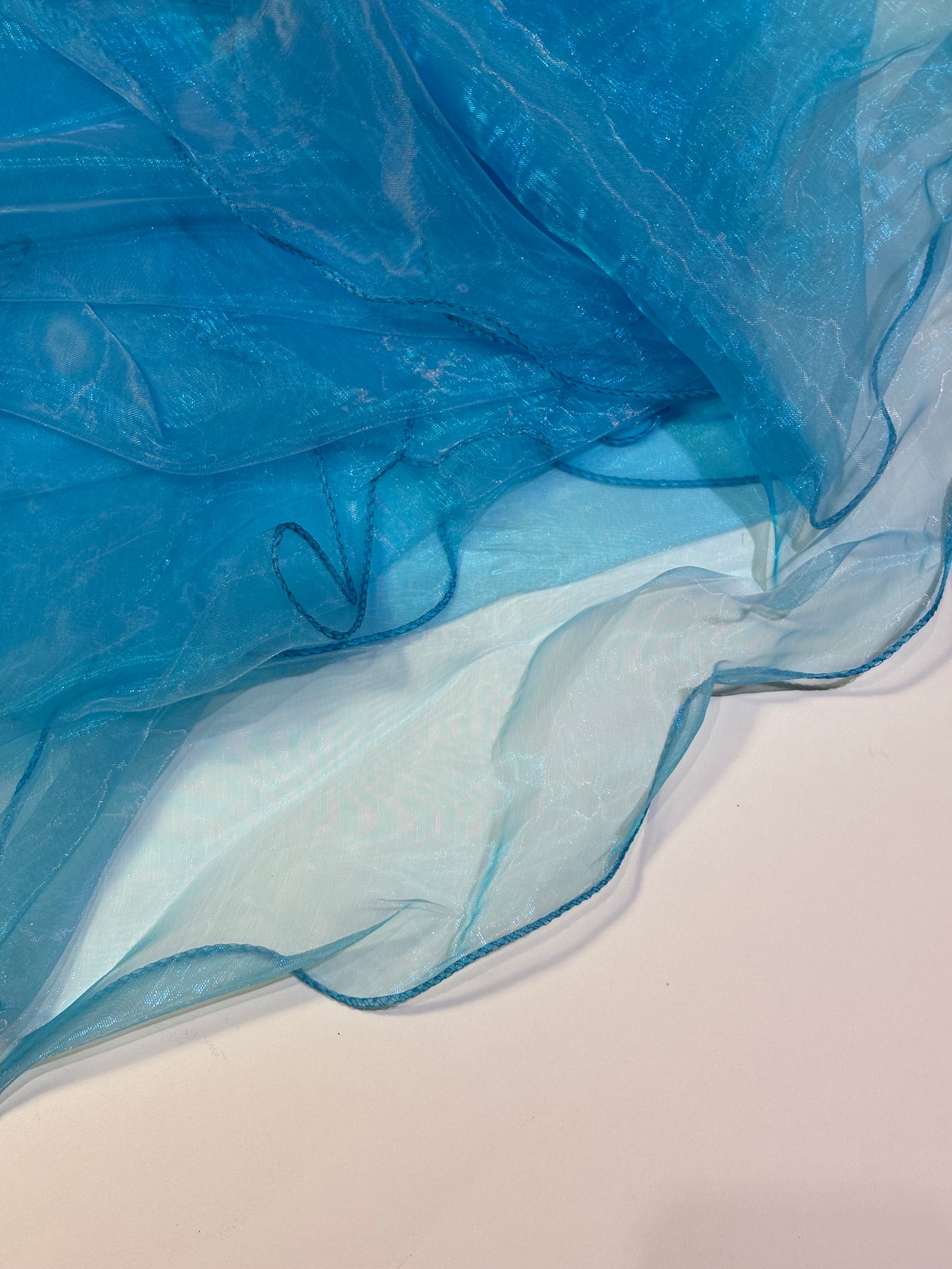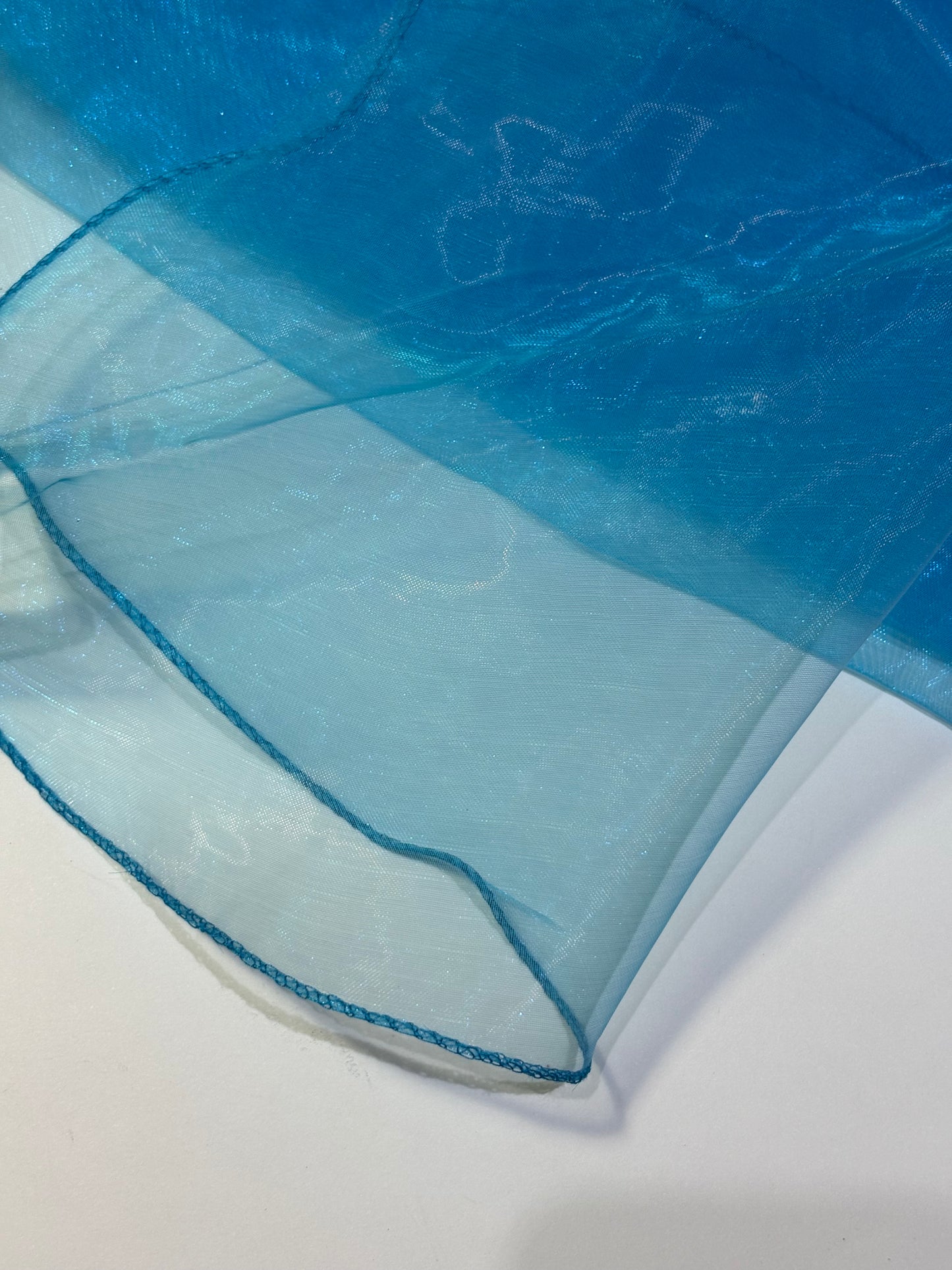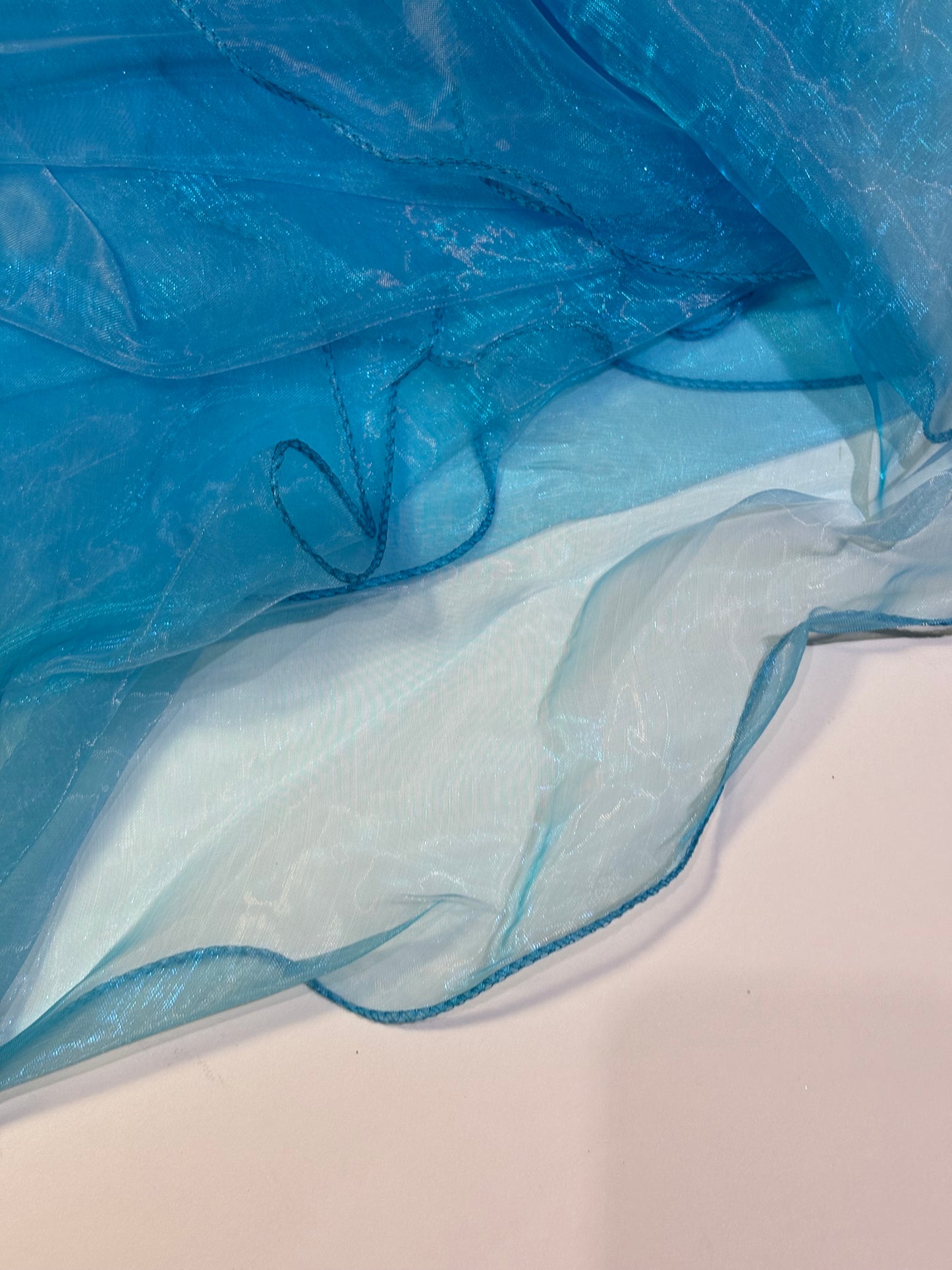High-quality Seamless, ruffled edge turquoise organza table overlay. Uses for table cover overlay, wedding, parties, celebrations, or any special event.