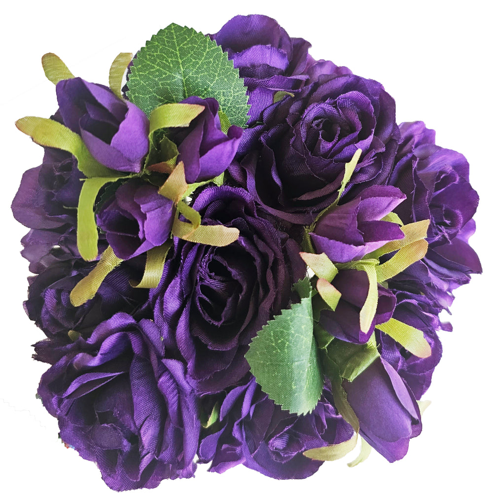 Our dark purple rose silk flower wedding bouquet is a perfect bouquet for bride and her bridesmaids. Each bouquet has 11 stems (9 stems of open rose & 2 stems of rose buds). Each open rose head is about 3 inches in diameter. Simply arrange it to appear full. Each bouquet is 11" tall, the bouquet measures approximately 8" in diameter.