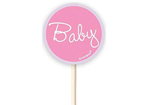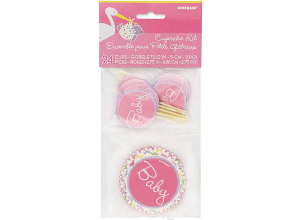 If you have the honor of hosting a baby shower or you wish to bring some treats, this Baby Girl Cupcake Kit is a fun alternative to a traditional cake. It is an excellent way to celebrate a baby girl's arrival. This 24-piece cupcake decorating kit comes with everything you need to beautifully present two dozen treats. Simply pour batter into the paper shells. After they are baked and cooled, add frosting. Then, you can top each one with an adorable topper. The wrappers have pastel polka dots running along the edges, and the bottoms read "Baby" in pink. The round toothpick topper also uses sweet lettering. These cupcake wrappers and picks can be a clever way for future parents to reveal the gender of their baby. Just conceal the treats in a box until you are ready to share the news. The Baby Girl Stork Cupcake Kit can be purchased with other items found in this collection for a coordinated sugar and spice event.
