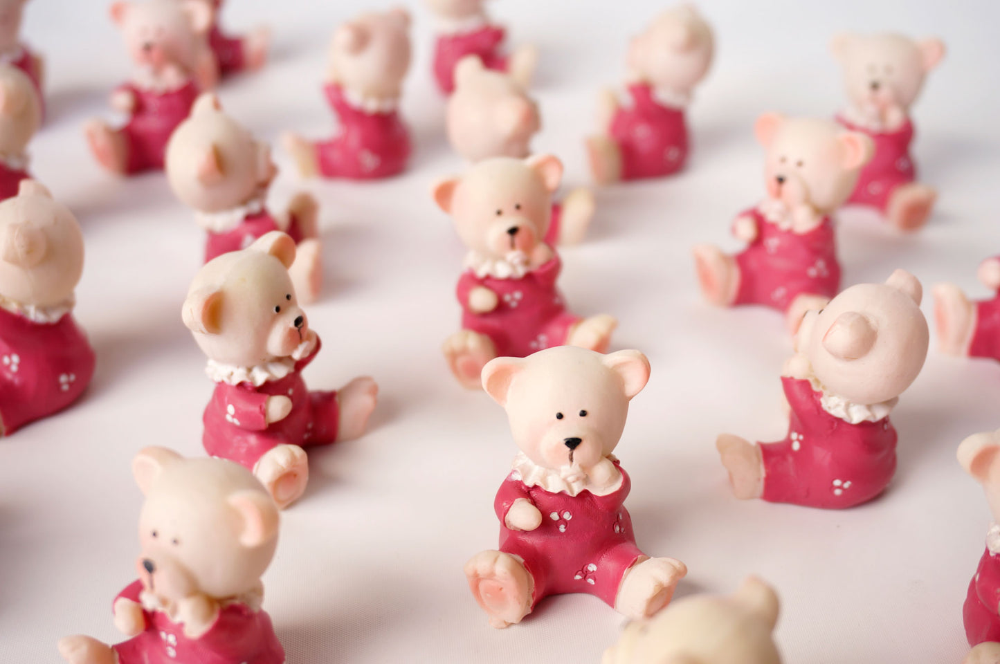 Bring a sense of joy to your baby girl's baby shower with these splendid polyresin miniature teddy bears. Featured in a full body pajama suit and sucking on a tiny pacifier, these teddy bears are great for decorating the tables and as a small keepsake for guests.