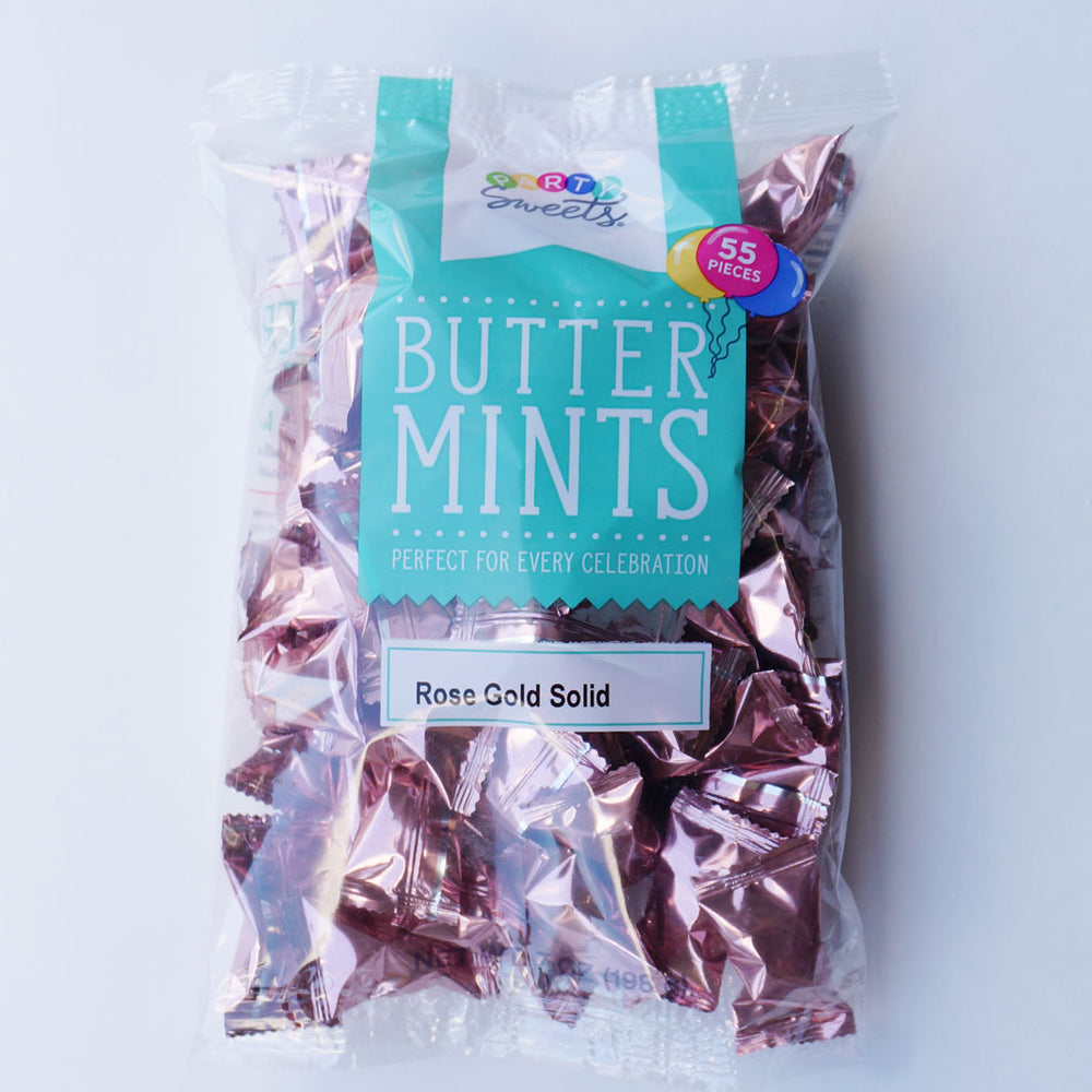 Metallic Rose Gold Party Butter Mints. These classic butter candy mints make an enticing table decoration. Each one is individually packed, and perfect for different occasions. Just set these mints out on the tables for a festive touch that your guests will surely notice and enjoy them.